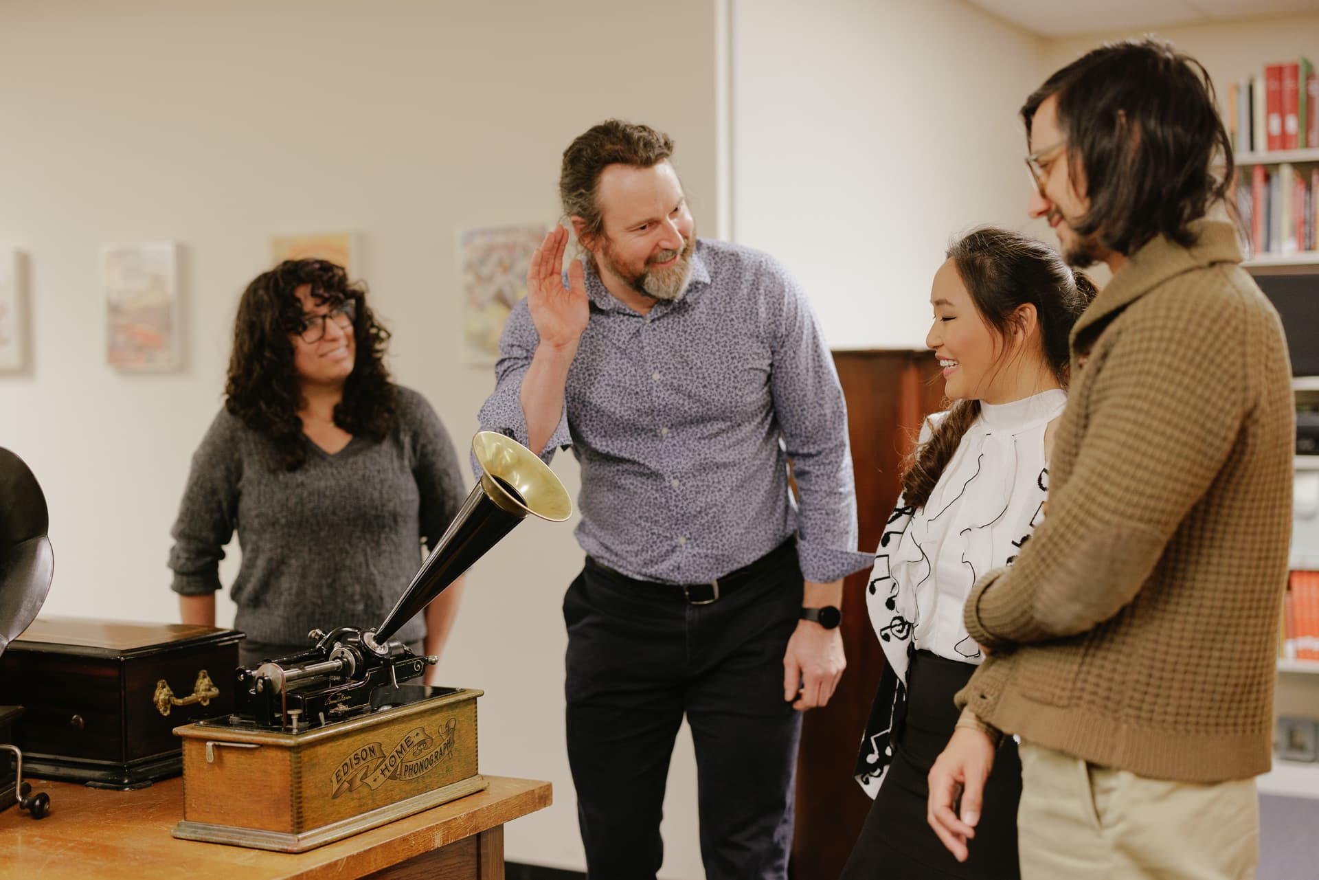 We have a reading room for individual and small-group study along with technology for engaging with the Archive of Recorded Sound’s historic media collections. We work with faculty to offer class sessions for undergraduate and graduate students, including demonstrations of our phonographs and player piano.